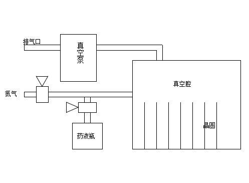 Eerst wordt de vacuümpomp ingeschakeld om te beginnen met stofzuigen. Zodra het vacuümniveau in de kamer de ingestelde waarde bereikt (deze waarde kan worden ingesteld door de P2-waarde op de vacuümmeter te wijzigen, zie de handleiding van de vacuümmeter), wordt stikstof geïntroduceerd. Na het bereiken van het ingestelde vacuümniveau (deze waarde kan worden ingesteld door de P1-waarde op de vacuümmeter te wijzigen) wordt het vacumeer- en stikstoftoevoerproces herhaald. Nadat het ingestelde aantal stikstofintroducties is bereikt, begint het vacumeren opnieuw, gevolgd door het inbrengen van de chemische oplossing. Na de ingestelde tijd stopt de introductie van de chemische oplossing en begint de wachtfase. Na de ingestelde houdtijd begint het vacumeren en het toevoegen van stikstof opnieuw, gedurende het ingestelde aantal cycli. Zodra het systeem het proces automatisch voltooit, wordt er een hoorbaar en visueel alarm gegeven, wat aangeeft dat de wafers klaar zijn om te worden verwijderd.